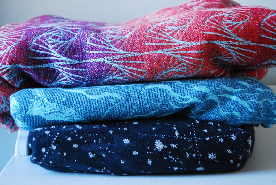 Depuis le tout début, ce qui m'attire dans les écharpes de portage, c'est entre autres l'incroyable variété de choix de couleurs et de motifs qui existent... Tissées main ou tissées machine, j'aime la gaieté qui émane des palettes plus vives et chaudes, la brillance et l'éclat des tons métalliques, la douceur et la sérénité des bleus …